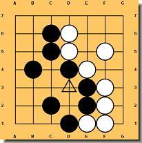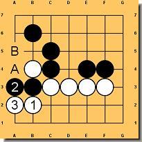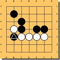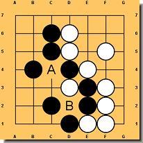 gdyż grozi obu grupom. Czarny może obronić jednego piona grając w A lub
