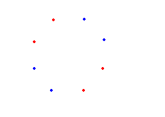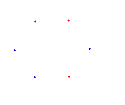 Liczba wierzchołków jest nieparzysta, więc do jednego z podzbiorów będą należały dwa kolejne wierzchołki. Niech to będą wierzchołki koloru niebieskiego. Jeśli do drugiego podzbioru będą należały wierzchołki koloru czerwonego, to pozostały (zielony)wierzchołek nie może należeć ani do zbioru pierwszego, ani do drugiego, gdyż z trzech wierzchołków powstanie trójkąt równoramienny.