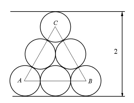 Z sześciu jednakowych okręgów ułożono piramidę o wysokości 2. Ile wynosi promień okręgu?