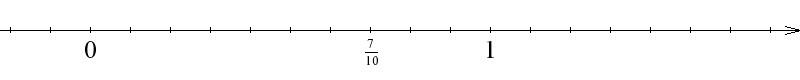 Ułamek $\frac{7}{10}$ jest większy od $0$ i mniejszy od $1$. Odcinek jednostkowy $[0, 1]$ dzielimy na dziesięć równych części.